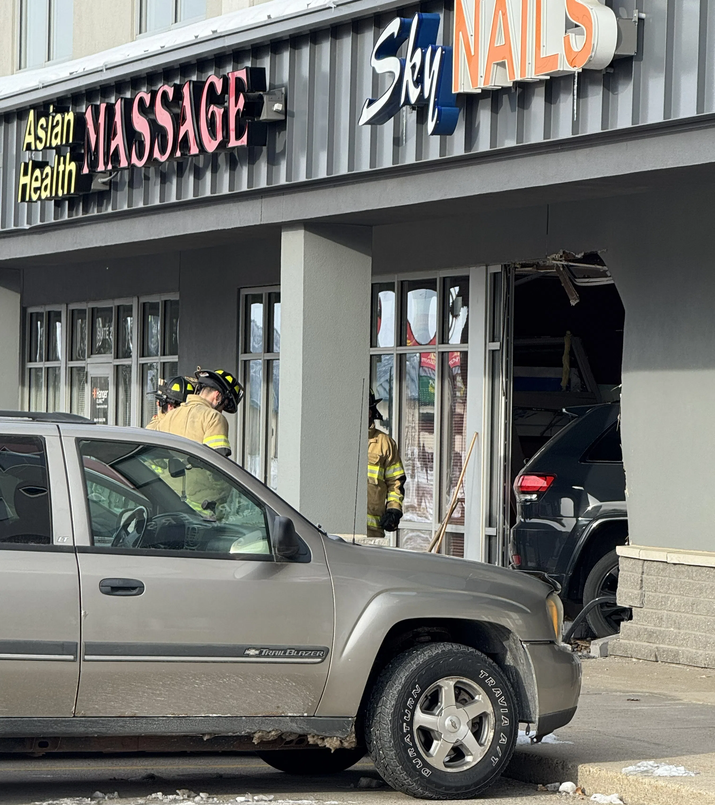 An SUV is all the way inside Sky Nails. The driver told officers she drove into the parking lot and while attempting to park in a parking spot, her vehicle slipped on ice. The driver tried to break, but stepped on the gas instead.