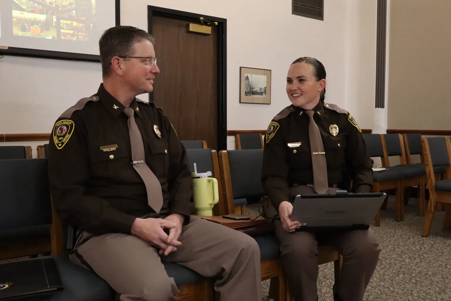 Col. Daniel Haugen and Lt. Jenna Clawson Huibregtse, North Dakota Highway Patrol, gave lawmakers a confidential briefing on capitol and personal security during a committee meeting on Jan. 8, 2026. (Photo by Jacob Orledge/North Dakota Monitor)